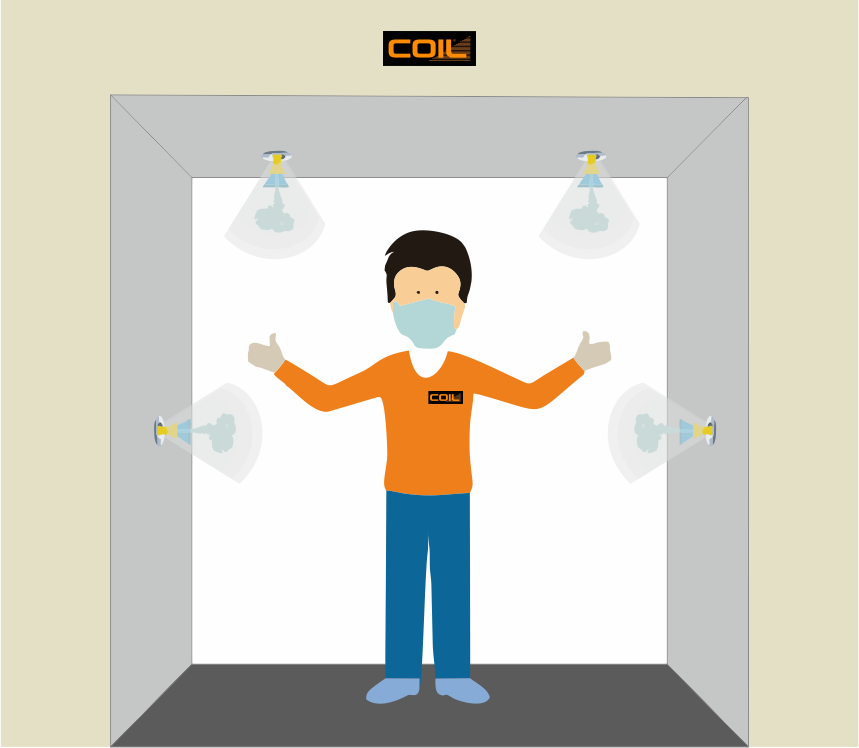 A ultrasonic atomizer system turns on at the entrance of the tunnel, and ensures the distribution of a sanitizing substance for complete sanitation of people, clothing, goods in transit. Through ultrasonic atomization, the sanitizing solution is atomized into hundreds of millions of particles nanometer size, which can eliminate 99,99% of bacteria or virus in the air on objects. Inside, a dispenser also ensures hand sanitization, before the entry of people into different environments. This system allows the saturation of any environment without wetting or damaging electronic components.