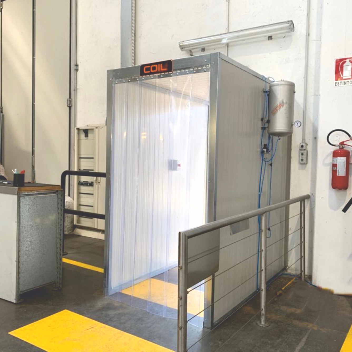 Designed to sanitize the entry and exit of people or people and goods, in work areas, such as in production areas, in the entrances of staff and suppliers, in loading and unloading areas, as a changing room area, on construction sites.