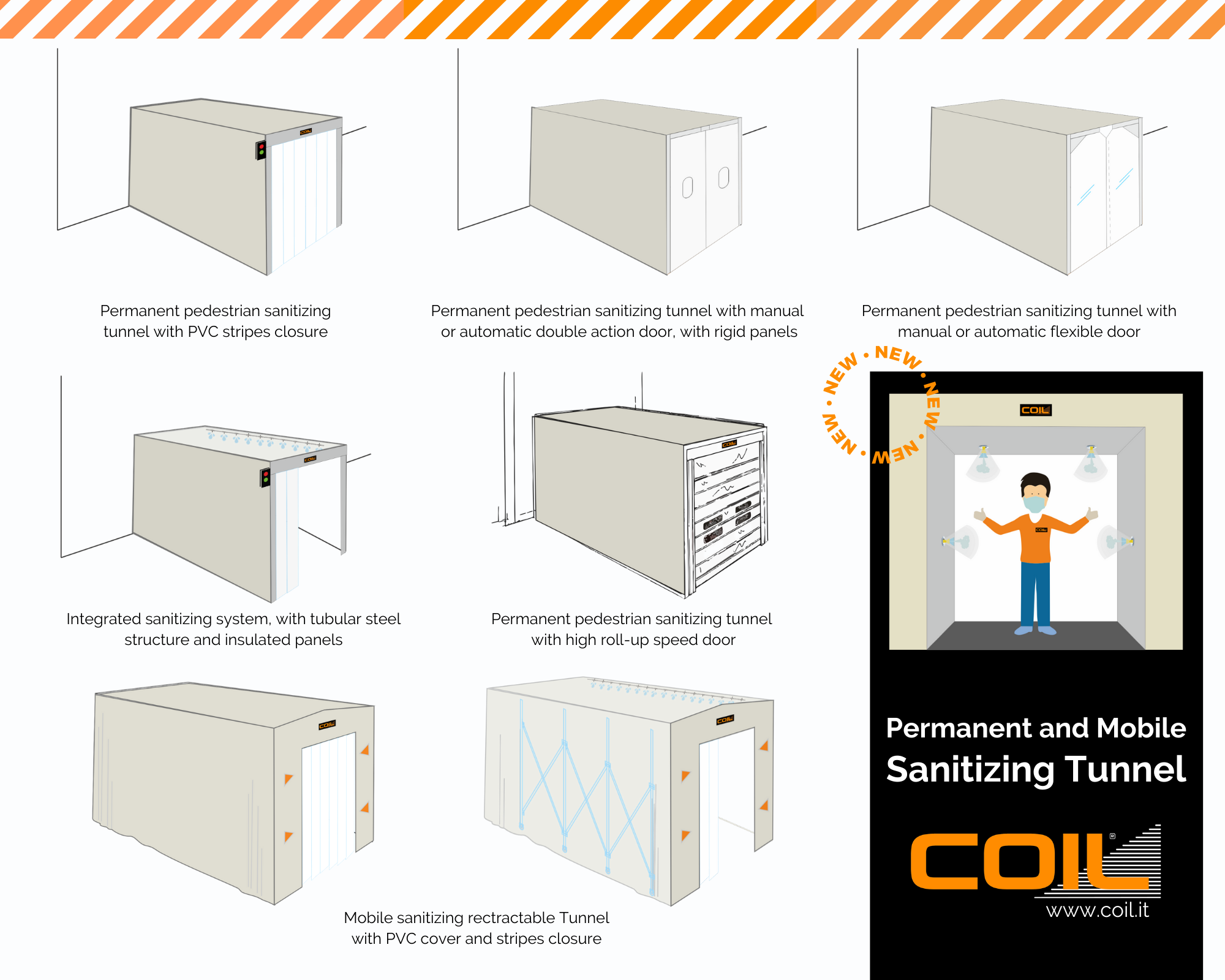Permanent or mobile sanitizing tunnels are self-supporting structures intended for the entry and exit of persons, goods only or goods and persons.